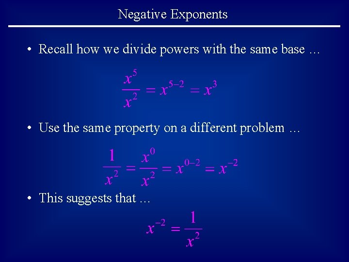Mar 10, 2020 · dividing negative exponents if the bases are the same, subtract the exponents.